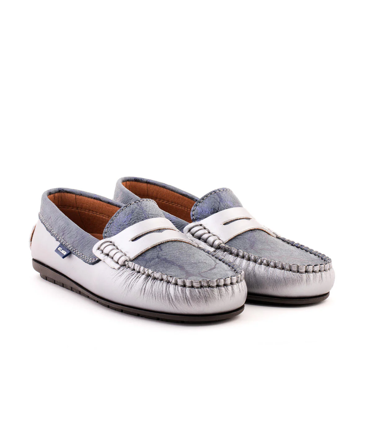 - Mocassins Originals com travessão em pele prateada metalizada e pala a constraste