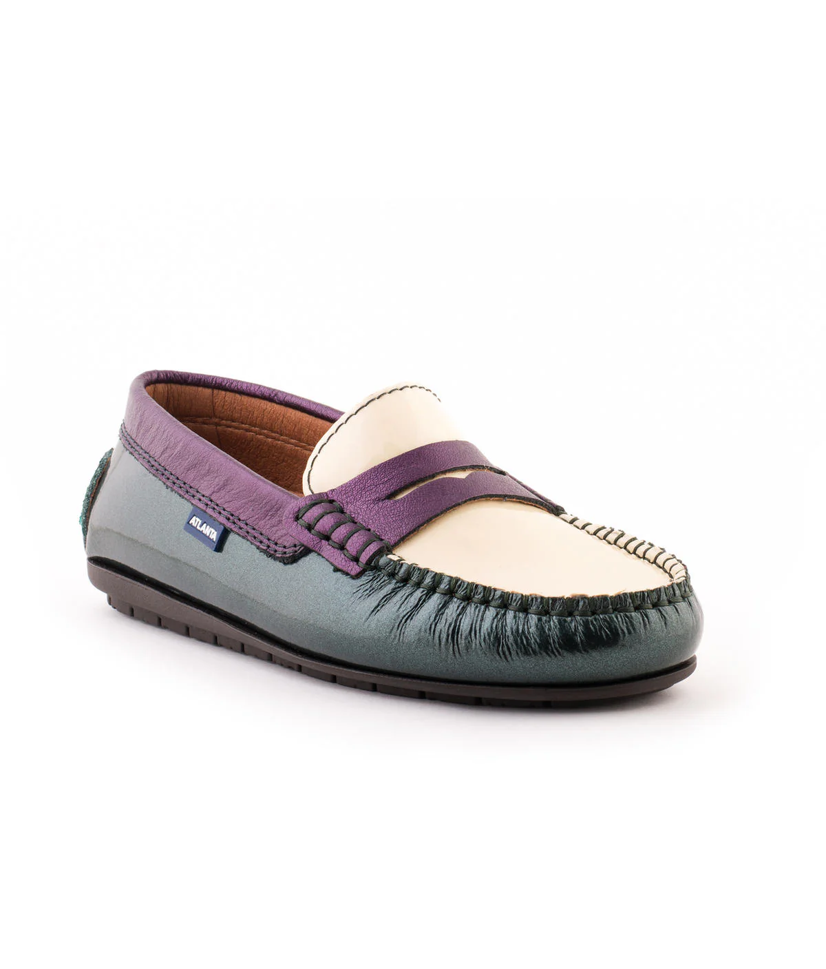 - Mocassins Originals com travessão em verniz verde e branco, e pele metalizada roxa